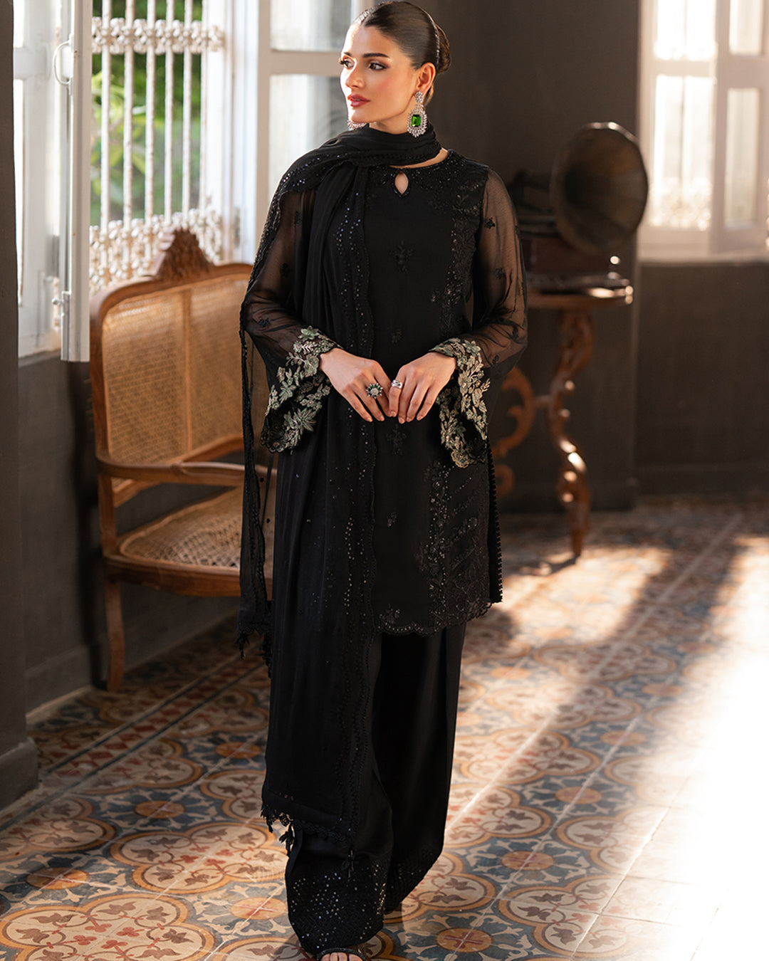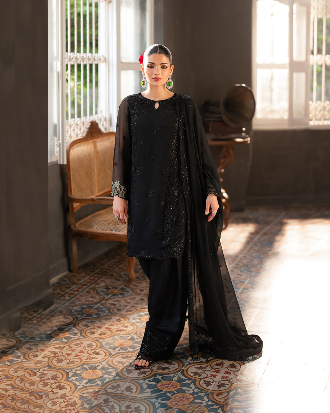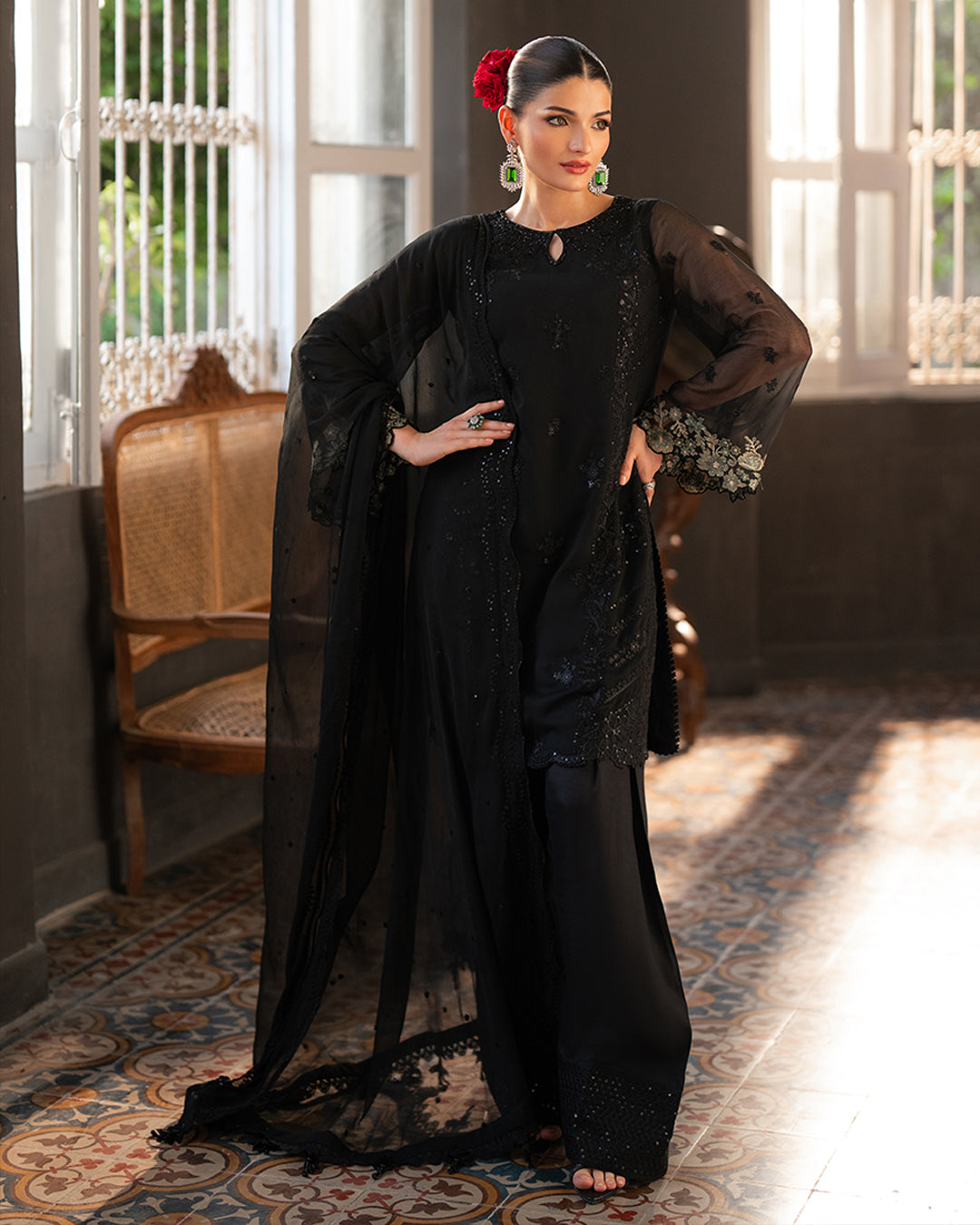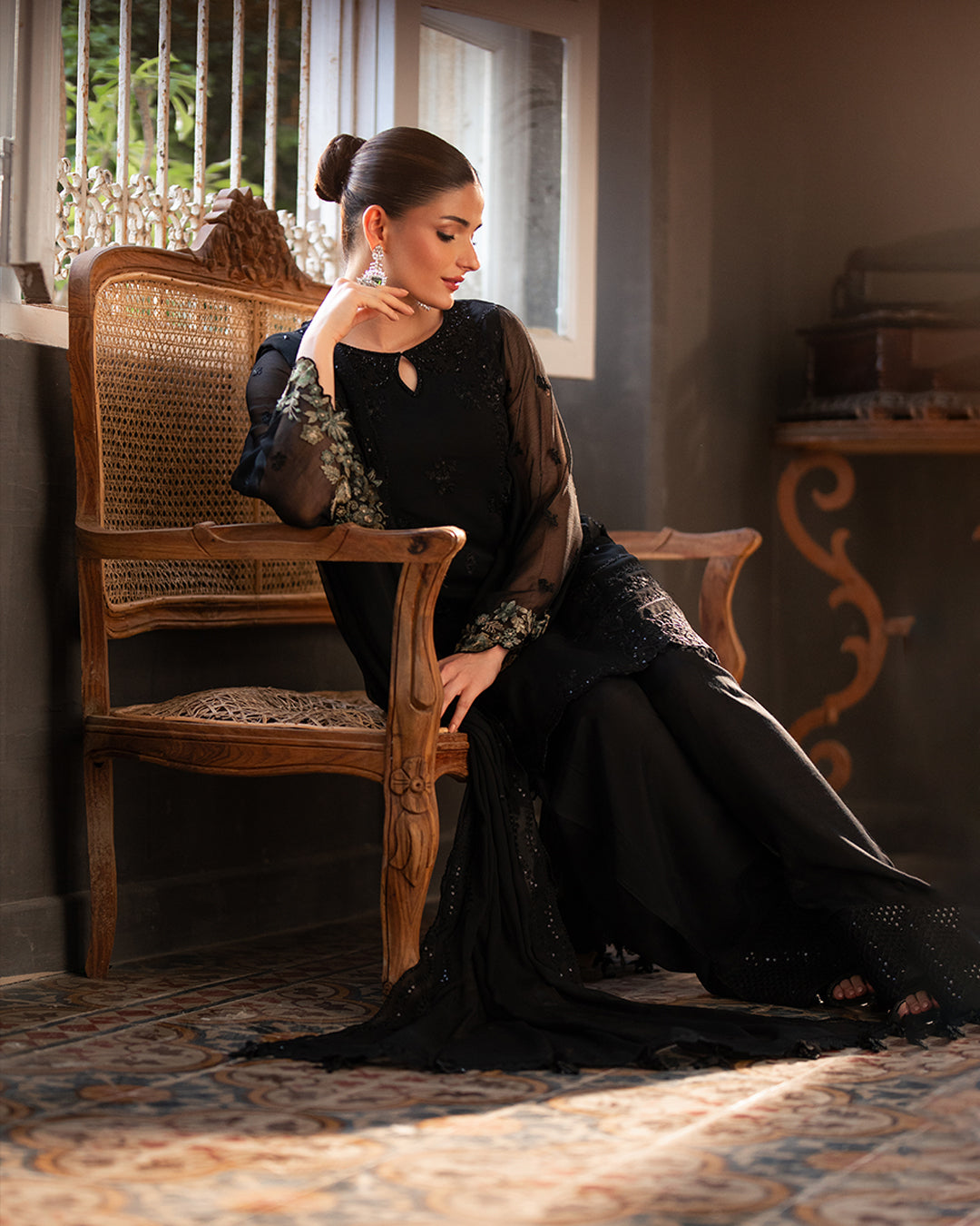 Crafted from rich chiffon, the shirt is adorned with heavy embroidery and hand embellishments that speak of fine craftsmanship. It’s paired with a raw silk trouser that adds structure and subtle sheen. The look is completed with an embroidered dupatta, light yet intricate — a graceful blend of elegance and effortlessness